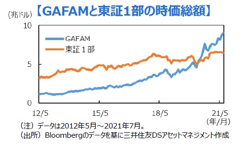 ■昨年には米国株の上昇をけん引するGAFAM(グーグルの持ち株会社アルファベット、アップル、フェイスブック、アマゾン・ドット・コム、マイクロソフト)の時価総額合計が東証1部全体の合計を上回って話題となりましたが、今年に入りその差は更に拡大しています。