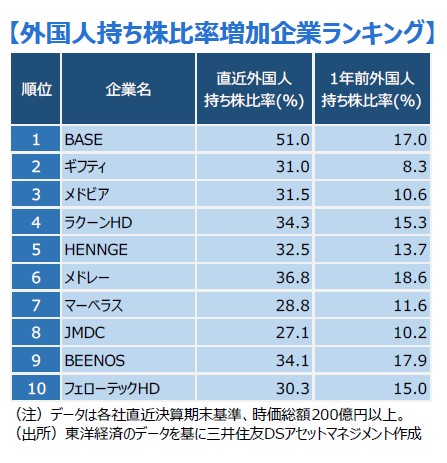 ■このような状況でも、外国人投資家が積極的に買っている日本株があります。右のランキング表は、過去1年あまりの間に外国人投資家の持ち株比率が上昇した上位10銘柄を抽出したものです。