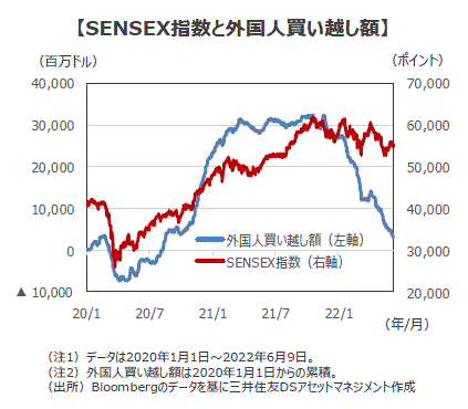 ■インド株市場への海外資金フローをみると、コロナショック後の20年5月以降海外投資家はインド株への投資を積極化し、大幅に買い越しましたが、今年に入ると、一転して大幅な売り越しに転じています。年初来では238億ドルと、大幅な売り越しが継続しています(6月9日時点)。
