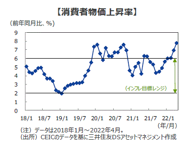 ■4月の消費者物価上昇率は前年同月比+7.8%と、4カ月連続でインド準備銀行(RBI)のインフレ目標(2.0~6.0%)を上回りました。経済回復で需要が増えていることに加え、ロシアによるウクライナ侵攻に伴う原油価格の高騰が重なり、インフレが一段と加速しました。