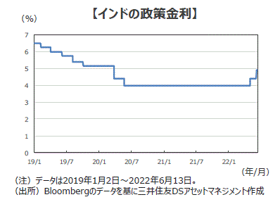 ■RBIは、22年度のインフレ見通しを5.7%から6.7%に上方修正しました。インフレ見通しは、23年1-3月期にインフレ目標範囲に戻ると想定しているとみられるため、弊社は、インフレが目標範囲に入るまで、RBIが継続的に追加利上げを行うと予想しています。政策金利は9月に5.40%、22年末に5.90%、23年末は6.25%と予想しています。