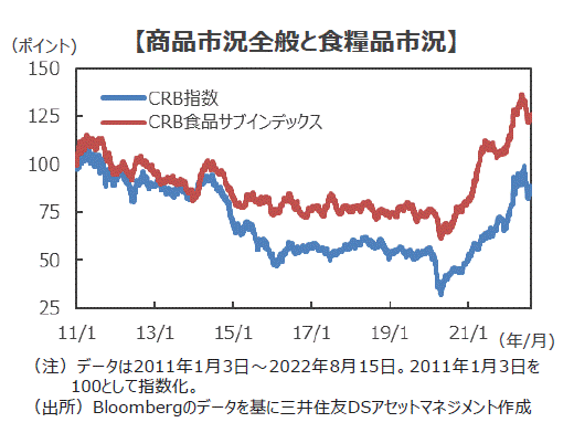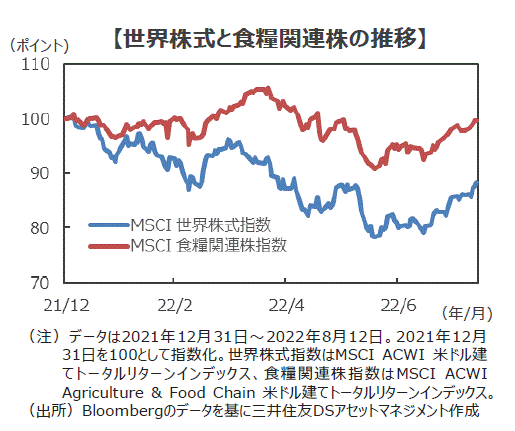 ■今年に入り市場では「高インフレ」と急激な金融引き締めによる「景気後退」が同時に進行する「スタグフレーション」への懸念が高まっています。食糧関連株はこうした「インフレ」と「不況」の両方への耐性を備えた、「スタグフレーション・ヘッジ」としての特性が注目されたこともあり、堅調なパフォーマンスを続けています。