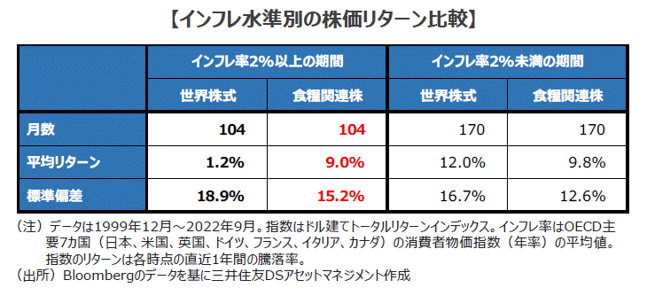 ■生活必需品の代表格ともいうべき食糧(食料)品は、耐久消費財や外食、レジャーといった選択的な支出にくらべて価格転嫁が容易なため、インフレ期における食糧関連株の相対パフォーマンスは極めて良好に推移する傾向にあります。1999年12月末からの約23年間のデータをふりかえると、G7主要7カ国の平均インフレ率が年率2%未満となった期間(170カ月)の株価騰落率を見ると、MSCI ACWIの年率リターンは平均で12.0%に達し、食糧関連株の9.8%を上回っています。一方、インフレ率の平均が2%以上となった期間(104カ月)では、食糧関連株の平均リターンは9.0%と低インフレ期と大差がないのに比べ、MSCI ACWIのリターンは1.2%まで大きく低下し、食糧関連株の堅調さが際立つ結果となっています。