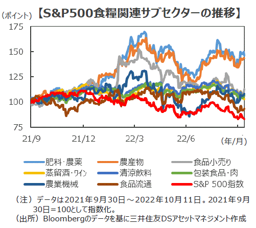 9月に発表された米国の消費者物価指数が市場参加者の想定を超える上昇となったことをきっかけに、「高インフレ」、「利上げ長期化」、「景気減速」という3つの懸念が世界の金融市場を揺さぶっています。まさに「三重苦」ともいうべき状況ですが、そうした市場環境にあって「不況抵抗力」や「インフレ耐性」の高さから、食糧関連株への関心が高まっています。
