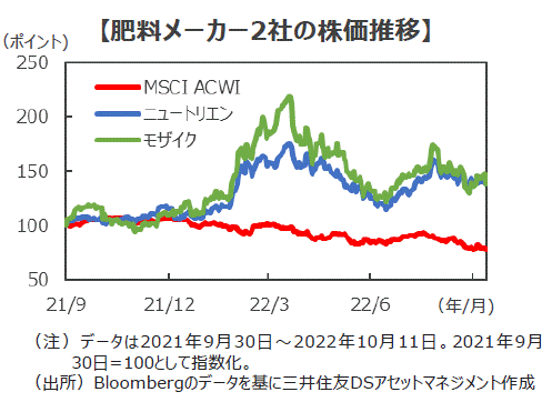 ■世界の株式市場の動きを示すMSCIオール・カントリー・ワールド・インデックス(MSCI ACWI)は、昨年の9月末以降の1年余りの間に▲20.4%下落しています。一方で、同期間の食糧関連株の代表的な指標であるMSCI ACWI・アグリカルチャー&フードチェーン・インデックス(MSCI 食糧関連株指数)は▲2.7%の小幅下落に留まっています。(騰落率はいずれも10月11日現在)