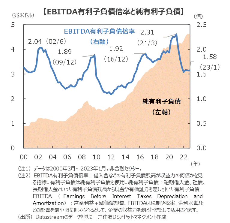 ■2023年1月の同倍率は1.58倍と、5カ月連続で1.5倍台で推移しています。2020年以降のコロナ禍、また、2022年のウクライナ情勢と、原材料価格の高騰など不透明要因が多い中でしたが、企業が収益を積み重ねることによってレバレッジはむしろ低下しており、良好な状態を維持しています。