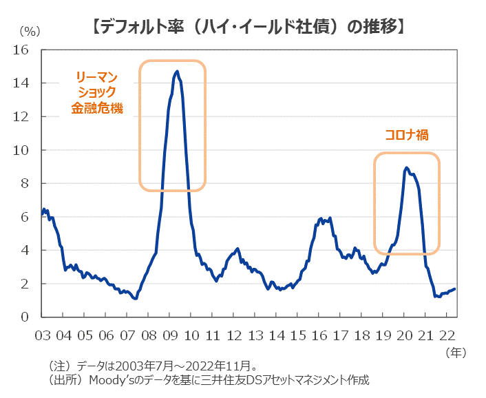 ■米企業のデフォルト率(ハイ・イールド社債)は、コロナ禍の中で大きく上昇しました。2021年後半以降は急速に改善し、足元では低水準で推移しています。