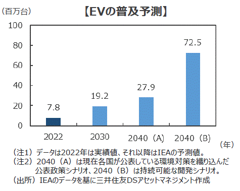 ■自動車業界のEVシフトが鮮明です。2022年の世界販売台数は780万台に達し、シェアは10%を超えたと報じられています。国際エネルギー機関(IEA)はEVの年間販売台数が2030年に19.2百万台、2040年には27.9百万台に達すると予測しています。また、パリ協定で定められた温暖化目標を考慮した「持続可能な開発シナリオ(Sustainable Development Scenario)」を達成するためには、2040年までに72.5百万台がEVに移行する必要があるとしており、世界的なEVシフトのシナリオは更に加速する可能性がありそうです。