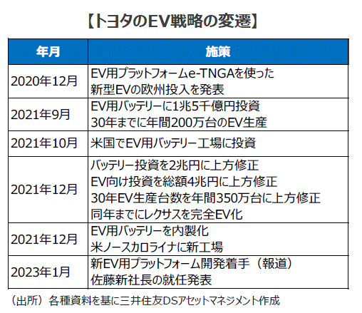 ■その言葉通り、トヨタのEV戦略は変化に対して驚くほど柔軟で現実的です。トヨタは欧州での環境規制強化の発表を受け、2021年9月にEV向けバッテリーに1兆5千億円を投じると発表しました。しかし、同年のEV世界販売台数がHEVを上回ることやテスラの収益性改善が確実になると、わずか3カ月後の同年12月にはバッテリー関連投資を2兆円に引き上げ、EV関連全体では計4兆円を投じ、2030年までにEV年間生産台数を200万台から350万台へ引き上げるとともに、レクサスを全てEV化とすると発表して業界関係者を驚かせました。