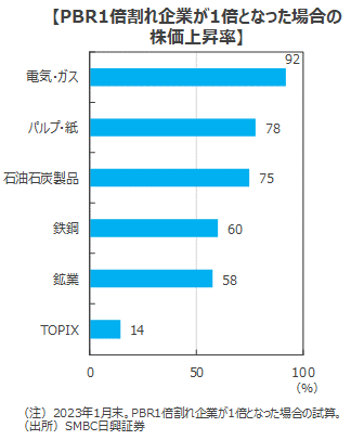 ■PBRが1倍を割れている企業数の割合は、23年1月末時点で、TOPIX対象企業で53%、プライム市場で51%、スタンダード市場で64%、グロース市場で7%です。仮に、現時点で、TOPIXベースでPBR1倍割れの企業が1倍になると、TOPIXは14%ほど上昇すると試算されます。セクター別にみると、電気・ガスが92%、パルプ・紙が78%、石油石炭製品が75%など、大幅な上昇になります(SMBC日興証券試算)。PBRが1倍になるだけでこれだけの株価上昇余力があることは注目されます。今後、上場を維持するために自社株買いを含むROE改善策を実行に移すなど、企業の覚悟が問われることになりそうです。