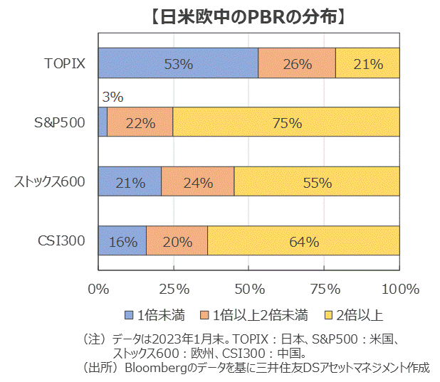 ■しかし、その一方、米欧中の主要指数でPBRの分布をみると、日本とグローバルの差は歴然です。特に、PBR2倍以上の割合は日本が21%ですが、米国で75%、欧州で55%、中国で64%に達しています。