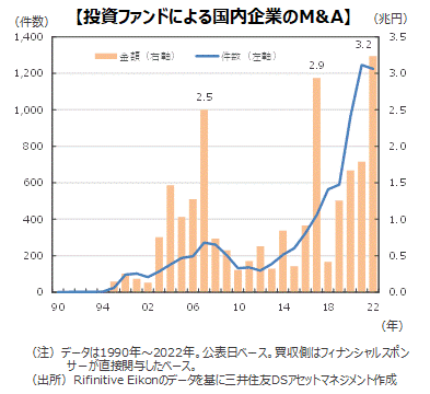 ■企業が自社の価値を高める動きに拍車がかかると考える2つ目の追い風が、活発化する投資ファンドによるM&Aです。投資ファンドによる日本企業へのM&Aは、18年をボトムに再び増加傾向にあります。22年の投資ファンドによるM&Aの取引総額は3.2兆円で、東芝メモリ株式会社(現キオクシア株式会社、買収金額2兆円)が買収された17年の2.9兆円を上回り、過去最高を更新しました。22年は低金利環境のもと、資金調達が容易であることに加え、大幅に円安が進んだことで、日本企業は取得しやすい対象だったと考えられます。