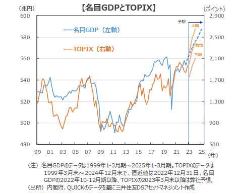 ■名目GDPとTOPIXは総じて連動する傾向があります。名目GDPが企業利益の総額に近い動きとなることやTOPIXが企業の時価総額を指数化したものであることから、比較的連動しやすいと考えられます。ただ、TOPIXは世界の株式市場の変動の影響を受けるため、経済の変動とは別の要因で動くことがあり、局面によっては乖離する場面も見られます。