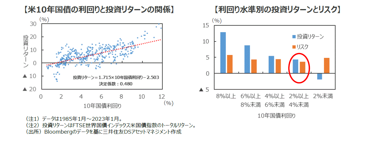 ■現在の米10年国債利回りは3.8%(2月15日)と、リスクに見合う投資リターンが期待できる状況にある、と考えることができそうです(右下図参照)。
