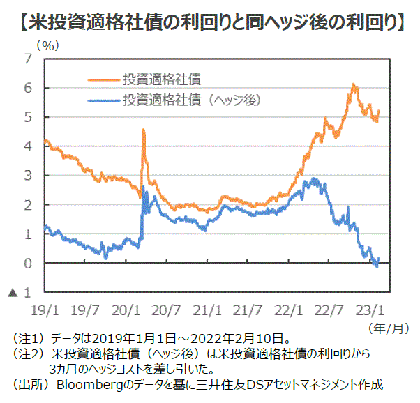 ■ヘッジコストの上昇により、米投資適格社債のヘッジ後の利回りは大幅に低下しています。足元でヘッジ後の利回りは0.18%と、米投資適格社債の利回り(5.23%)をヘッジコストでほぼ使い切る形となっています。したがって、現在のヘッジコストを考慮すると、ヘッジ付きで米投資適格社債に投資するメリットは低いように思われます。