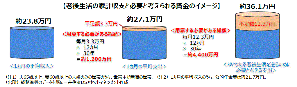 ■総務省の家計調査(新型コロナウイルス感染症等の影響がない2019年)によると、高齢夫婦無職世帯(夫65歳以上妻60歳以上の夫婦の世帯)では、1カ月の平均収入は約23.8万円でした。一方、1カ月の平均支出は約27.1万円と、毎月約3.3万円の赤字です。さらに、「ゆとりある老後生活」のためには約36.1万円が必要(生命保険文化センター調べ)と考えられ、毎月約12.3万円の赤字になります。つまり、平均的な支出では約1,200万円、「ゆとりある老後生活」を送りたい場合には約4,400万円が必要と考えられます(下図参照)。