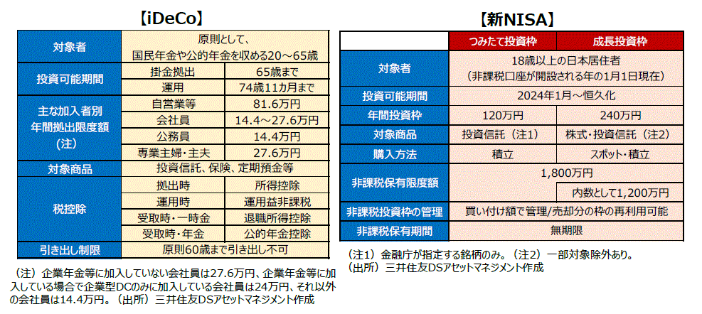 ■運用効率を高めるためにはiDeCoやNISAといった税制優遇制度を活用すると効果的です。iDeCoは「個人型確定拠出年金」のことで、公的年金とは別に給付を受けられる私的年金制度の一つです。加入者によって拠出上限額は異なりますが、掛金は全額所得控除されるほか、運用時にかかる運用益が非課税となります。受取時には、年金か一時金かの受け取り方法の違いによってそれぞれの税控除が受けられます。NISAは「少額投資非課税制度」のことで、株式や投資信託の売却益や配当益にかかる税金が一定の投資上限額まで非課税となります。