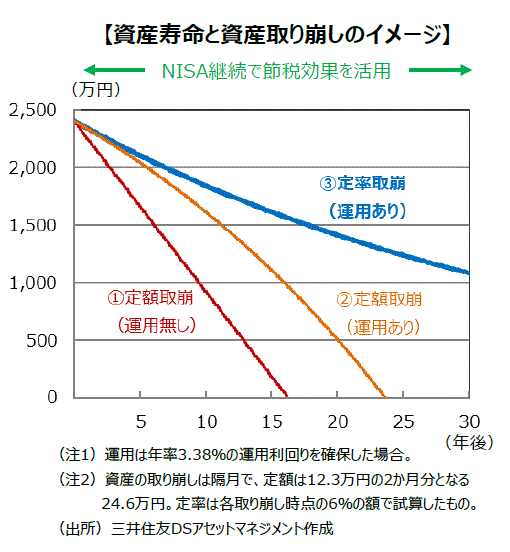 退職世代となってからも、NISAを上手に活用しながら、毎月定額ではなく定率で資産を取り崩し、運用をより長く続けることで、「資産寿命」は延ばすことができると考えられます。