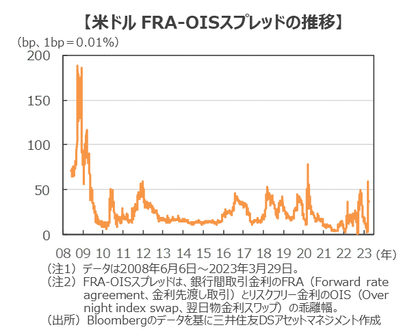 ■3月上旬の議会証言で、パウエル米連邦準備制度理事会(FRB)議長は、堅調な雇用や粘着的なインフレを背景に3月に利上げ幅を再拡大する旨を示唆しました。その直後に発生したSVB問題を契機に金融市場は一変し、金融不安の様相を呈することとなりました。米金融機関の信用リスクを示す「FRA-OISスプレッド」は一時的に60bpを超えるところまで拡大した後、足元では40bp前後で推移しています。同スプレッドは今回の問題が起こる前の10bpを下回る状況に比べると高止まっています。