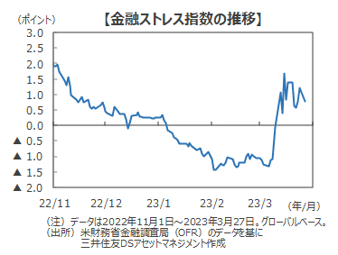 ■金融市場の緊張感を示す金融ストレス指数も▲1前後から+1前後まで引き締め方向に一気に上昇しました。足元でも+0.77と高止まっています。今後、中小銀行を中心に貸出態度は一層厳格化する可能性が高く、年央以降の景気見通しにとってはマイナスに作用すると考えられます。