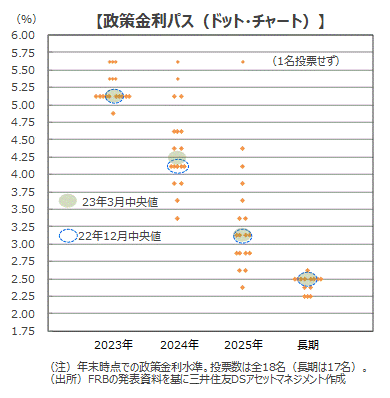 ■同時に発表されたFOMCメンバーによる金利予想を示すドット・チャートは、利上げの終着点(ターミナルレート)想定を据え置き、残りの利上げがあと1回に留まるというハト派的な見通しとなりました。金融不安が深刻化すれば、即利上げを停止する姿勢をみせたことで、金融市場に安心感を与えたとみられます。