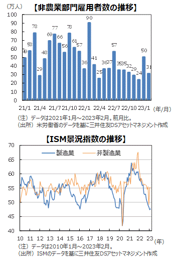 ■2月の非農業部門雇用者数は前月比31万人増でした。大幅な増加となった1月の50万人に続いて事前予想を上回りました。また、週次でデータが発表される米国新規失業保険申請件数も増加しておらず、雇用情勢は引き続き堅調とみることができそうです。