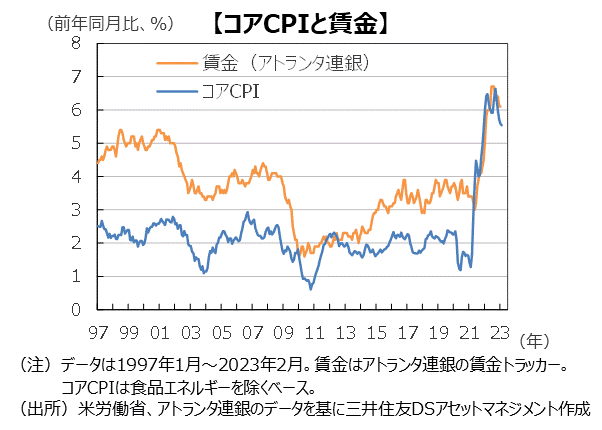■インフレは最悪期を脱してはいるものの、粘着的に推移しており、正常化が遅れています。振れの大きいエネルギーと食品を除くコア消費者物価指数(CPI)のうち、財価格の増勢は在庫の復元により一巡しました。ただ、サービス価格は家賃や余暇娯楽を中心に目立った鈍化は見られていません。