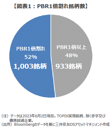 ■現在、東京証券取引所(東証)に上場する株式のほぼ半数がPBR1倍以下で取引されていますが(図表1)、こうした状況は今後、様変わりする可能性があります。それは、東証がPBR1倍割れ企業に対して「PBR低迷の要因分析と改善策の開示」を強く要請すると決めたことがきっかけです。さらに、「物言う株主」といわれるアクティビストファンドが、低PBR企業をターゲットにしていることが伺えることも、この傾向に拍車をかけています。