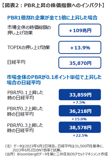 ■現在、東証には2,157銘柄が上場していますが、このうち1,003銘柄がPBR1倍割れで取引されています(除く赤字及び債務超過企業)。このPBR1倍割れ企業のPBRが全て1倍まで上昇すると、時価総額で109兆円、市場全体に+13.9%の押し上げ効果が生じることになります(図表2)。日経平均株価(日経平均)に換算すると、31,500円の日経平均が35,870円まで上昇する計算になります。