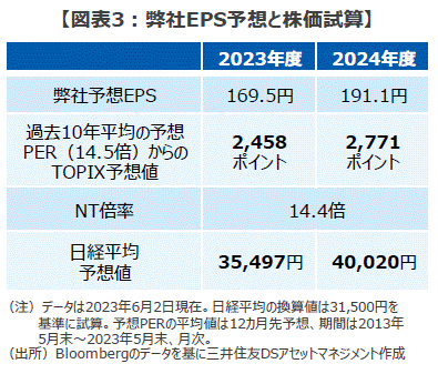 ■足元で急速に上昇している日本株ですが、業績面から見た株価に割高感はそれほど感じられません。弊社ではTOPIXの一株当たり利益(EPS)について、今年度は169.5円、来年度は191.1円まで増加するものと試算しています(図表3)。これで6月2日のTOPIX終値を割った予想株価収益率(PER、株価を一株当たり利益で割った数値)はそれぞれ12.9倍、11.4倍となり、割高というには程遠い水準です。