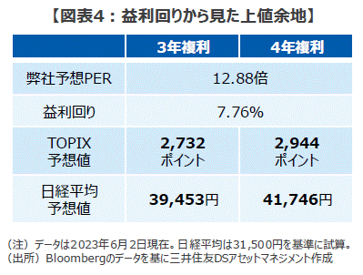 ■弊社予想のEPSをもとに計算した今期のTOPIXの益利回り(PERの逆数、一株当たり利益を分子に、株価を分母に逆転させて計算する株の利回り)は+7.76%になります(図表4)。年率+7.76%の複利(利益を再投資しながら運用する場合のリターン)で運用を続けると3年間のリターンは+25.2%に、4年間では+34.9%に達しますので、日経平均は3年後には39,453円、4年後には41,746円まで上昇する計算になります。