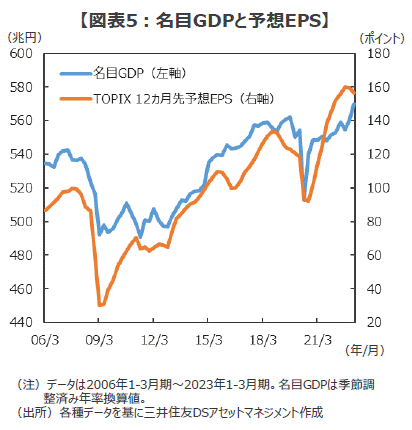 ■このため、TOPIXの12カ月先予想EPSと名目GDPの推移をみると、両者は連動する傾向が強いことが確認できます(図表5)。