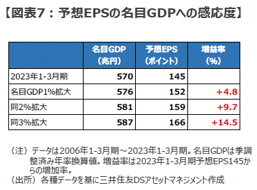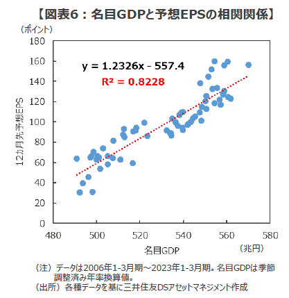 ■やや専門的な分析になりますが、12カ月先予想EPSと名目GDPの関係を回帰分析と呼ばれる統計的な手法で分析すると、この2つの数字のつながりの深さが確認できます。両者の相関の強さを表す決定係数(相関係数の2乗)は0.8228と、一般に「極めて高い説明力がある」とされる0.8を上回っています(図表6)。