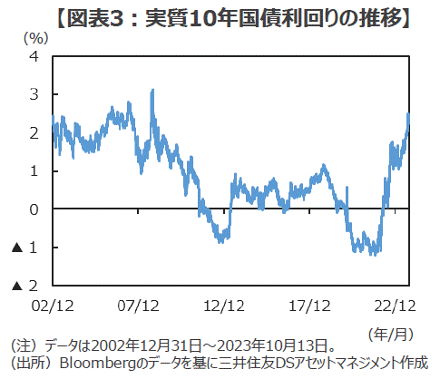 ■ここもと米国のインフレ率は緩やかな低下傾向にありますが、この長期金利の上昇を受けてインフレを除いた長期の実質金利が急上昇しています。10年国債利回りから市場が織り込む期待インフレ率を除いた「実質10年国債利回り」は、2022年の夏以降おおむね1~2%のレンジ内で推移してきていましたが、9月のFOMC後には一時約2.5%まで急上昇し、期待インフレがマイナス圏に急落したリーマンショック時以来の高水準に達しました(図表3)。