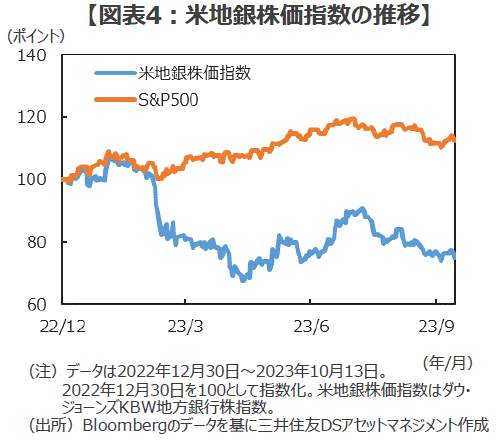 ■そんな「健全な陰謀論」の観点からFRB急旋回の背景を探ると、気がかりなのが金融システム不安の問題です。今年3月には米地銀が立て続けに経営破綻に追い込まれ市場に激震が走りましたが、米地銀を取り巻く経営環境は厳しさを増しています。というのも、経営悪化の背景には度重なる利上げによる保有債券の価格下落がありましたが、ここもとの利上げ長期化で米長期金利は今年3月よりも高水準にあるからです。このため、米地銀株は現在も低迷が続いています(図表4)。