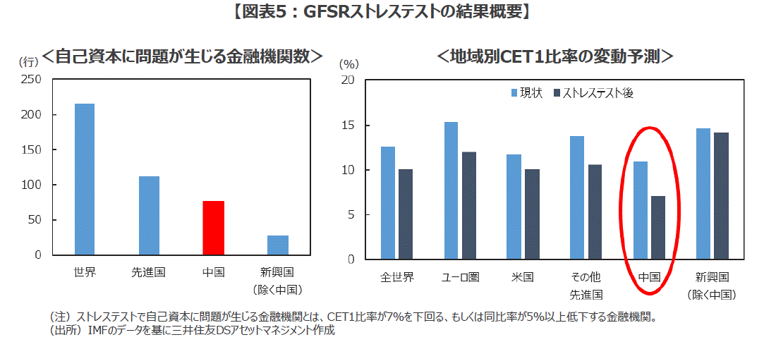 ■今回のGFSRでIMFは世界29カ国、約900行の金融機関のストレステスト(厳しい経営環境下での経営の健全性確認)を実施していますが、中核自己資本(CET1)比率がバーゼル規制で求められる7%を割り込む、ないしはCET1比率が5%以上低下する金融機関が、215行に達すると試算しています。中でも、その惨状が懸念されるのが、不動産不況が直撃している中国の銀行セクターです。GFSRのストレステストでCET1比率に問題が生じるとされる215行のうち、76行が中国の銀行とされています。また、同ストレステストの結果、中国の金融セクター全体のCET1比率は11%から7.1%まで低下し、金融システム全体が資本不足に陥りかねない可能性が指摘されています(図表5)。