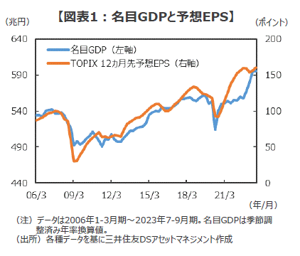 ■名目GDPが注目を集めるのは、その拡大が企業の売上や利益と密接な関係にあるからです。例えば、2022年度の日本の税収は国・地方の合計で約71.1兆円に達し、コロナ禍前の2019年度の約58.4兆円から約2割も増加しました。これは、名目GDPの成長が、課税対象となる企業の売上や利益を大きく押し上げたためだとされています。そして、過去のデータを振り返っても、名目GDPと企業の一株当たり利益(EPS)は連動する傾向があることが確認できます(図表1)。