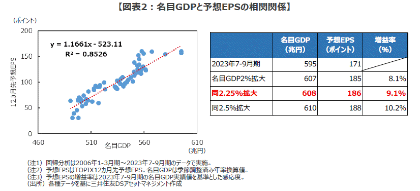 ■弊社では、日本の名目GDPは底堅い実質GDPの成長とマイルドなインフレが続くことで、2023年度は+5.5%、2024年度は+2.6%の成長が続くものと予想しています。そして、デフレ脱却により日本の名目GDPが今後も長期にわたり年率+2.25%の成長を続けると仮定すると、EPSは同約9.1%増加する計算になります(図表2)。