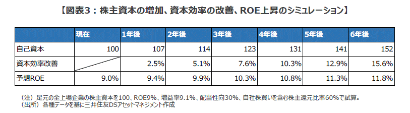 ■具体的な数字で見てみましょう。仮に、日本企業の今後の増益率を9.1%、足元のROEを9%、配当性向を30%と仮定します。すると、日本の上場企業の株主資本は年率約7%増加して6年後には現在の約1.5倍になります。そして、市場全体で最終利益の30%に相当する額の自社株買いが実施されると(低PBR企業中心に平均PBR1倍の株価水準での実施と仮定)、発行済み株式の減少を通じた資本効率の改善が加わり、日本株全体のROEは6年後に約11.8%まで上昇する計算になります(図表3)。