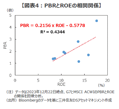 ■ROEとPBRの間には概ね正の相関関係、平たく言うと「ROEが改善するとPBRも上昇する」関係があるとされています。そこで、主要先進7カ国(G7)と世界株価指数(MSCI ACWI)のROEとPBRの関係について回帰分析をおこない、日本(TOPIX)のROEが11.8%に改善した場合のPBRの変化を試算しました。