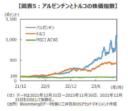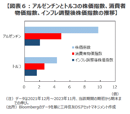 ■トルコでは、「高インフレには金融緩和を」というエルドアン大統領の奇手が災いし、同国の消費者物価指数はこの2年ほどの間に約2.6倍に上昇しました。また、アルゼンチンでは度重なるデフォルトと通貨安から、消費者物価指数は同約4.8倍に上昇しています。一方、両国の株式市場はこの間急騰を続けており、トルコのイスタンブール100種指数は2021年末から2023年11月末にかけて約4.3倍に、アルゼンチンのメルバル指数にいたっては同約9.7倍に上昇しています(図表5)。