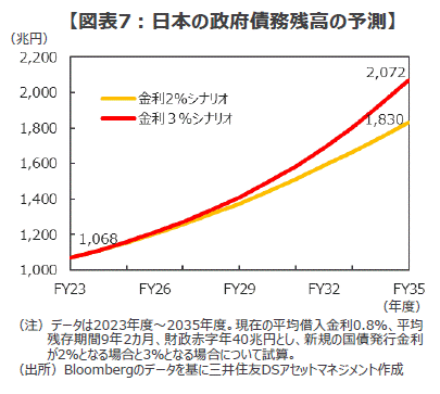 ■日本の国債残高は2023年度末で1,068兆円まで増加すると見込まれています。そして、年間の利払い費8.5兆円から逆算される国債の平均金利は約0.8%になります。また、国債の平均残存期間は約9年2カ月なので、残高の約11%の借り換えが毎年発生する計算になります。政府は2024年度の一般会計当初予算案で国債の想定金利を1.9%に引き上げましたが、デフレ脱却による金利上昇で国債の新規発行金利が仮に3%まで上昇すると、単純計算で12年後の2035年度には、日本の国債残高は2,000兆円を突破することになります(図表7)。