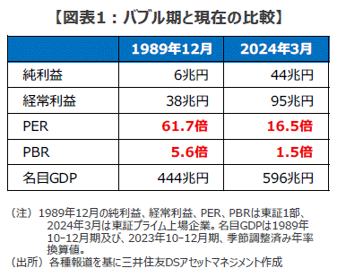 ■足元の東証株価指数(TOPIX)のバリュエーションは、株価収益率(PER)で16.5倍、株価純資産倍率(PBR)で1.5倍ですが(いずれも3月11日現在)、バブル期に日経平均が最高値を付けた1989年12月末は、PERは61.7倍、PBRに至っては現在の米国株をも上回る5.6倍を付けていました(図表1)。