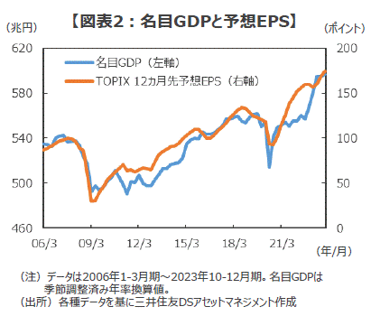 ■「実質GDPがほとんど伸びない中で、日本株が上昇を続けるのはおかしい」との意見をよく耳にします。一見、もっともらしく聞こえますが、あなたの日本株投資意欲を削ぐこうした「おせっかい」には注意が必要でしょう。というのも、企業の売上や一株当たり利益(EPS)といった株価を決めるファンダメンタルズは、インフレ調整後の実質GDPではなく、インフレ調整前の「素の数字」である名目GDPに連動する傾向が強いからです(図表2)。