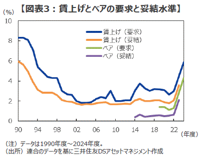 ■連合は3月7日に24年度の春闘の要求集計を公表しましたが、定期昇給を含む賃上げ率は前年度比+5.85%(23年度+4.49%)、ベースアップ(ベア)は+4.30%(23年度+2.83%)となり、賃上げ率の要求水準としては30年ぶりの高水準となりました。近年の要求と妥結の乖離を踏まえると、24年度の労使が妥結する賃上げ率は+5.0%程度(23年度+3.58%)、ベアは+3.5%程度(23年度+2.12%)に着地するものと見込まれ、いずれも昨年度の実績や、市場コンセンサス(賃上げ率+3.9%、ベア+2.2%)を上回る大幅な賃上げが実現することとなりそうです(図表3)。