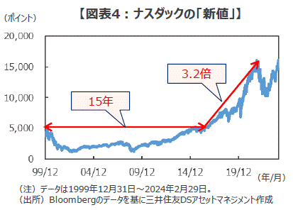 ■例えば、2000年のネットバブルで急騰した米ナスダック指数はその後急落し、「新値」に達するまで15年の期間を要しました。しかし、ひとたび史上最高値を更新すると市場関係者の高値警戒感をよそに、その後6年あまりの間に約3.2倍に上昇しました(図表4)。