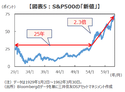 ■こうした「新値」は、第二次世界大戦後の米国株でも出現しています。米国の代表的な株価指数であるS&P500種指数は1930年代の大恐慌により実に86%も暴落し、1955年に「新値」に到達するまで25年の期間を要しました。そして、「新値」に到達したS&P500は、その後の約7年間で約2.3倍に上昇しています(図表5)。