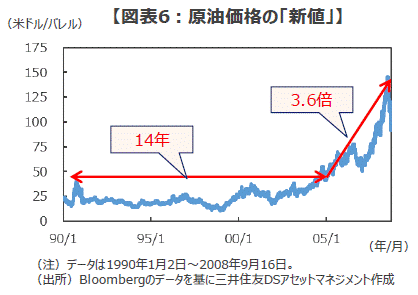 ■こうした「新値」の出現とその後の上昇相場は、株式市場に限ったことではありません。例えば原油市場では、1990年の湾岸戦争の勃発により急騰した原油価格はその後急落し、高値を更新するのに14年の期間を要しました。そして、「新値」の出現後は約4年で約3.6倍に急騰しました(図表6)。