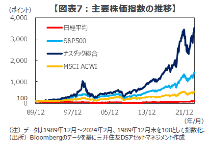 ■例えば株価指数の推移を見ると、日経平均は1989年12月末との比較で約1倍に留まります。一方、世界の株価指数(MSCI世界株指数)はこの間約5倍に、米国のS&P500種指数は約14倍に、そしてナスダック総合指数にいたっては約35倍まで上昇しています(図表7)。