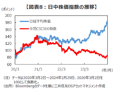 ■例えば、海外から中国への直接投資は一時マイナスに転じるなど、資本逃避の動きが鮮明です。一方、日本では巨大半導体工場の建設をはじめ、設備投資の国内回帰が鮮明です。また、就職難の中国を逃げ出し、日本での留学や就職を目指す中国人の若者が増えていると報じられています。そして、株式市場では日中間で株価指数の両股開きが鮮明で、中国から日本への「ヒト、モノ、カネ」のグレートシフトを連想させる動きがみられます(図表8)。